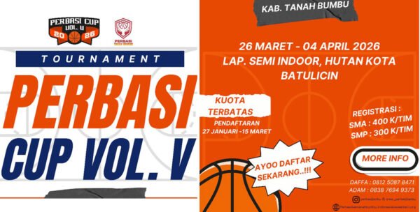 BATULICIN,  Mediabersujud.com–  Kejuaraan basket antar pelajar se-Kabupaten Tanah Bumbu bertajuk PERBASI Cup Vol V Tahun 2026 resmi dimulai hari ini, Kamis (26/3/2026) pukul 15.00 WIB di Lapangan Basket Hutan Kota Batulicin. Kegiatan ini menjadi momentum penting dalam pengembangan atlet basket muda di daerah.